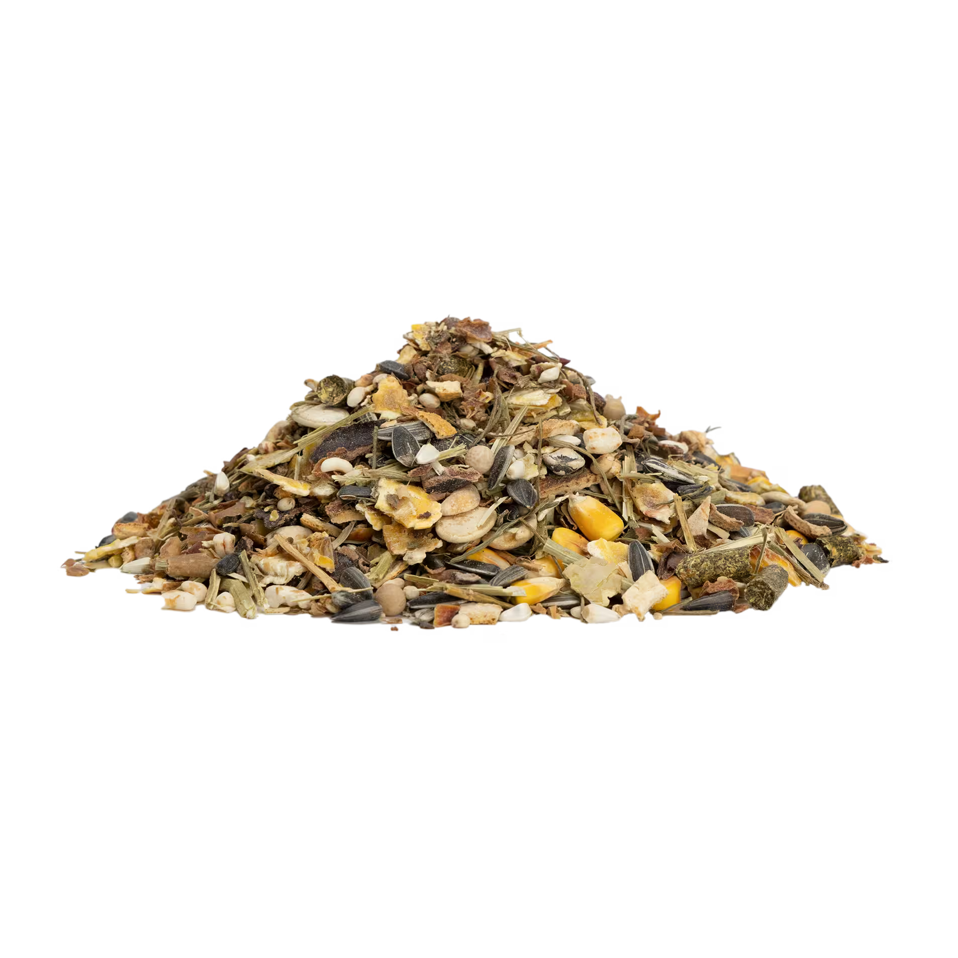 kukuruzne pahuljice, vitaminske granule, kukuruz, grašak, pšenica, sušene jabuke 5,5%, lucerka, pomorandže 4,5%, rogač 4,5%, prugaste semenke suncokreta, sirak, crne semenke suncokreta, pahuljice od graška, šafranika, sušena šargarepa 2,5%, orašasti plodovi 2,5%, bele semenke suncokreta, semenke bundeve, seno, semenke trava.