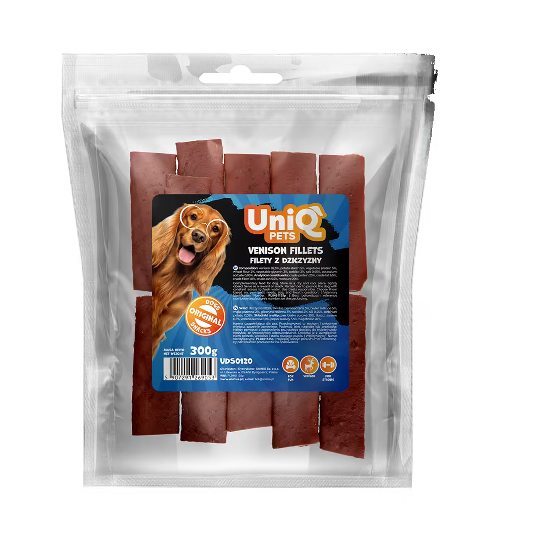 UNIQ poslastice za pse, 300 g, fileti od mesa divljači (jelena)